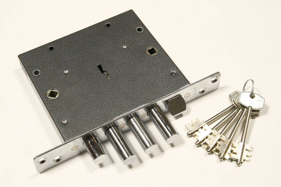 Сувальдные. Эти изделия являются очень надежными. Схема сувальдного дверного замка заключается в наличии сувальд внутри механизма. Ключ имеет вид так называемой бабочки или солдатика и при проворачивании приподнимает их до заданного кодировкой уровня.