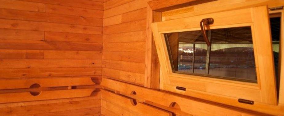 Намного выгоднее изготовление деревянных окон для бани своими руками. Их можно установить в парилке и остальных помещениях (моечной и предбаннике). Конечно же, изначально потребуется вложиться в материал и прочие комплектующие, а затем постоянно поддерживать окна в надлежащем состоянии: обрабатывать антисептическими, водозащитными и прочими растворами, проводить покраску, регулировку фурнитуры и ликвидацию трещин.