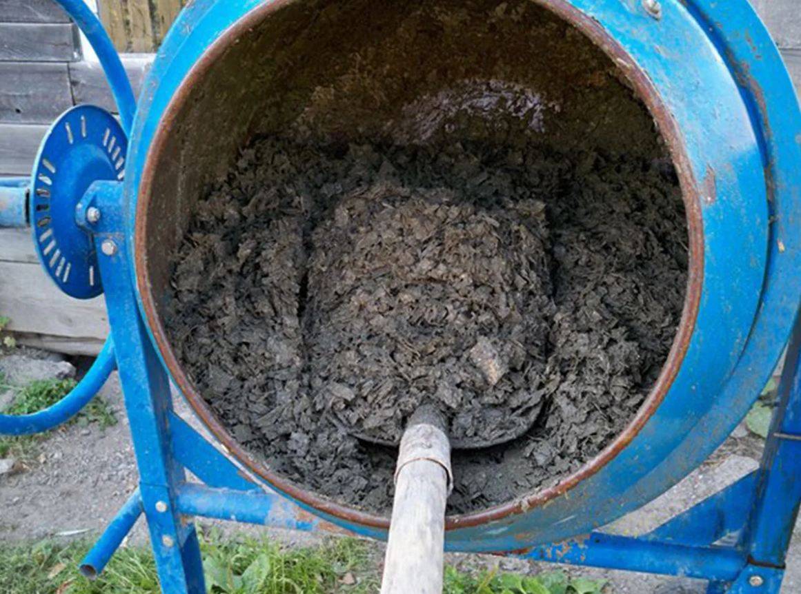 Массу обязательно требуется прессовать. При этом для замеса применяется не обычная бетономешалка, а принудительная. В ней хорошо смешивается щепа с другими ингредиентами.
