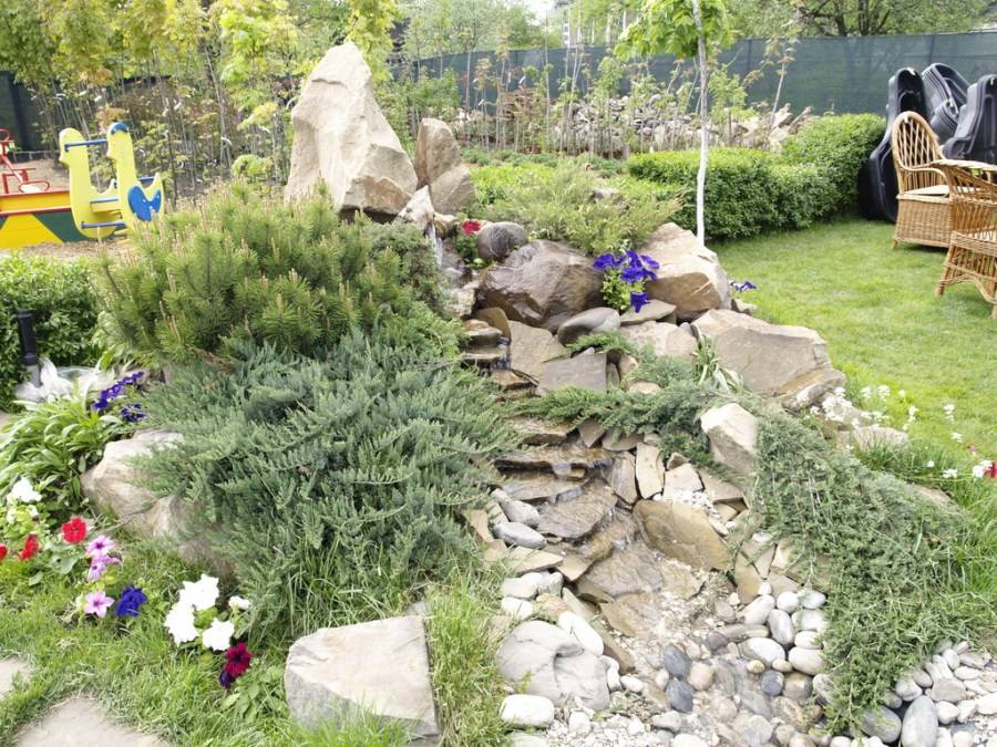 В оформлении удачно будут смотреться известняк или сланец. Большие булыжники следует заглубить, а мелкофракционные – разбросать по площади. В грунте можно высадить низкорослый кустарник или же растения, которые стелются.