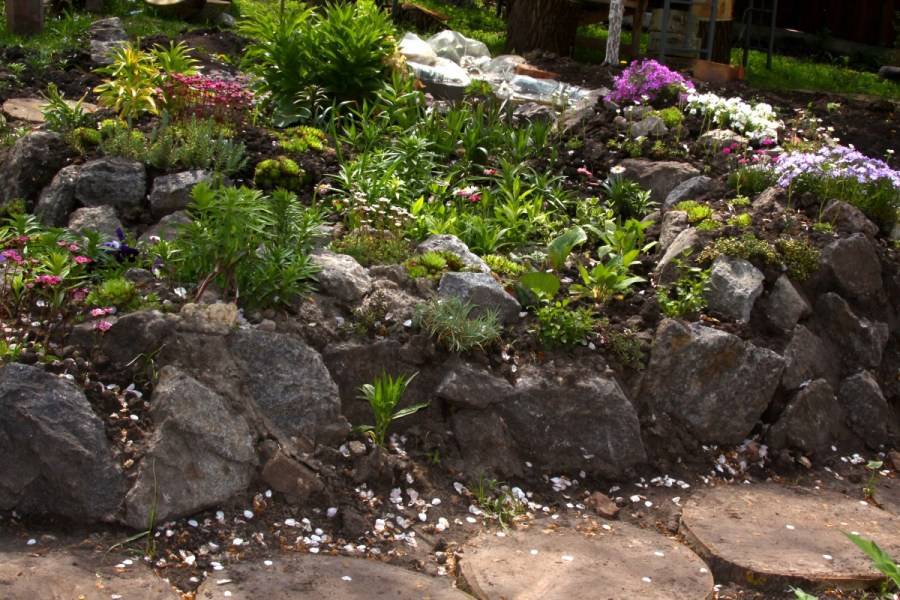- Пустоты между камнями заполняют плодородной почвой для посадки различных цветов.