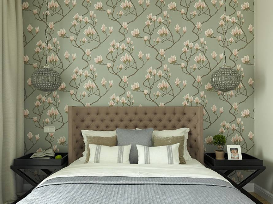 Из розовой палитры популярны насыщенный колер фуксии и пастельные тона. Сочетают их с нежными светло-голубыми, белыми, мятными, коричневыми, бирюзовыми, серыми, оливковыми оттенками. Оклеивая спальню розовым с двумя видами шпалер, лучше предпочесть более светлые.