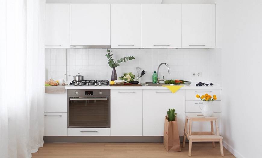 Белая кухня выглядит изысканно и визуально будто бы расширяет стены, что очень важно для небольших помещений, например, в хрущевке. Но будьте осторожны: если вы приобретаете новую белую кухню вместо старой такого же цвета, может возникнут ощущение, что ничего не изменилось. Ни другая форма кухонных фасадов, ни новые ручки на ситуацию не повлияют
