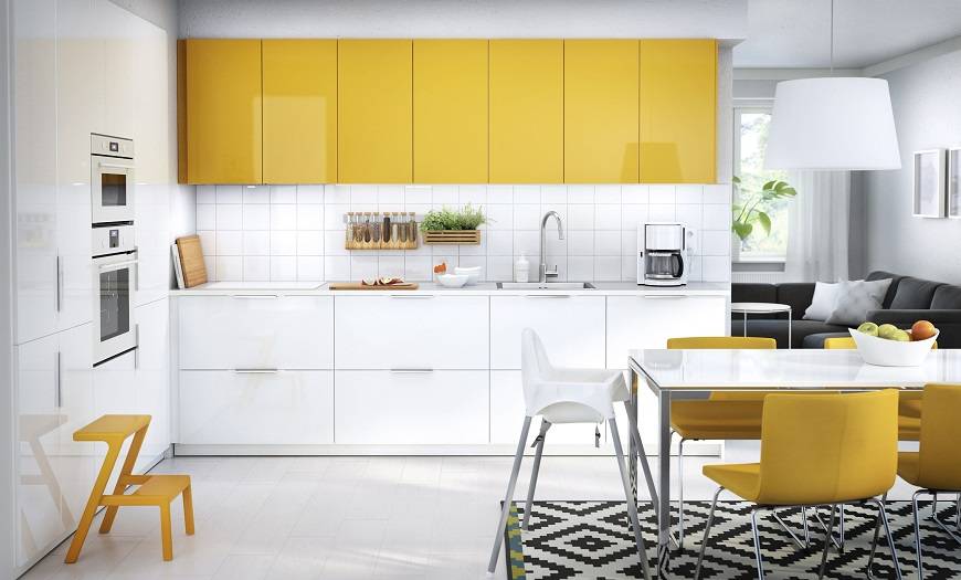 «Взбодрить» интерьер можно с помощью ярких оттенков икеевской мебели, которые используются в сочетании с нейтральным цветом. К примеру, желтые столешницы на белом фоне или красный фасад первого уровня в сочетании с более сдержанным вторым.