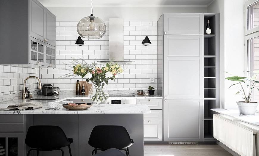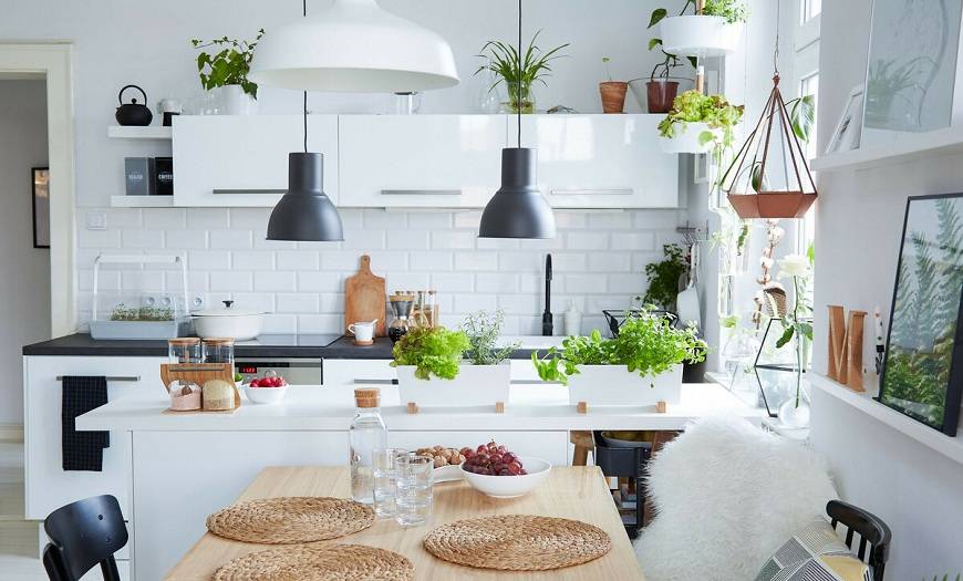 Главный тренд 2017 года, идеально подходящий для икеевских кухонь, выглядят стильно, современно, уютно. Ощущения стерильности можно избежать за счет использования более темных оттенков, придающих глубину пространству: например, серым рабочим столешницам или темным ручкам.