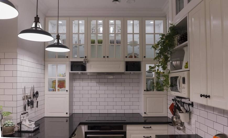 Для маленькой кухни лучше выбирать фасады светлых оттенков (белый, серый, под дерево)