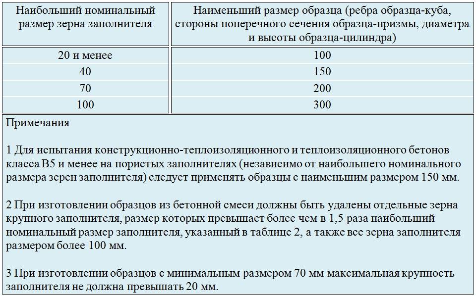 Габариты контрольных образцов взаимосвязаны с размером использующегося в составе смеси наполнителя