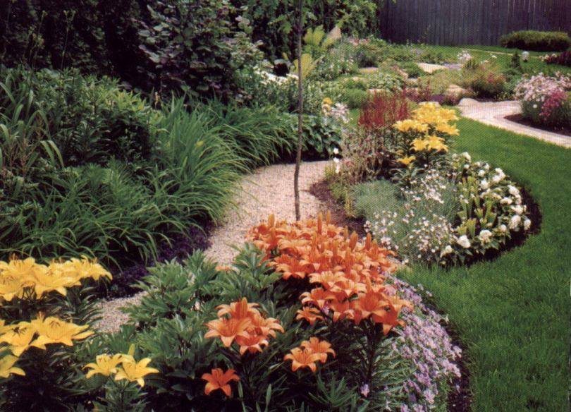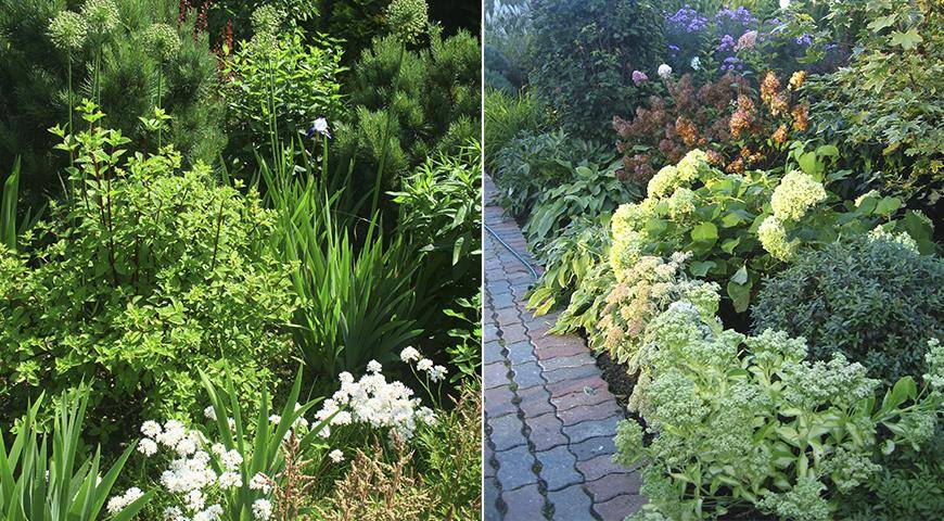 Эти миксбордеры из многолетников преимущественно. Преобладающая цветовая палитра состоит из оттенков зеленого, синего, розового, также белого. Не забудьте про хвою и другую зелень.