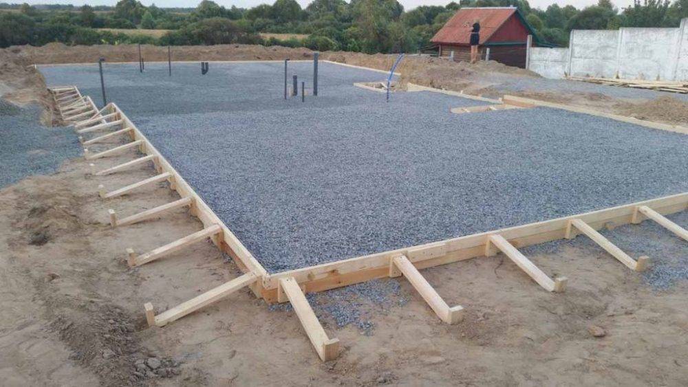 Подушка из гравия и песка с опалубкой подготовлены для последующей заливки раствора