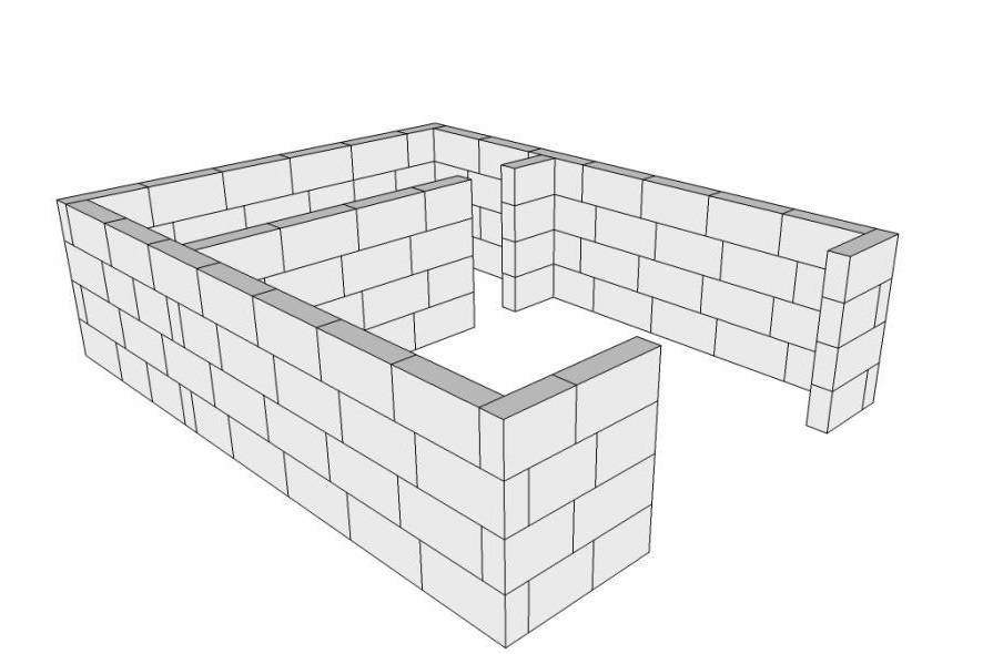 В процессе кладки стен в два блока используется плашковая перевязка вертикальных швов. Глубина подобной перевязки должна быть не менее чем 100 мм. Сопряжение стенок разных направлений нужно устраивать исключительно наклонной штрабой с глубиной перевязки минимум 200 мм (не допускается вертикальная штраба). Внутренние перегородки и стенки возводятся по тем же правилам, что и наружные стенки. Сопряжение внутренних и наружных стенок выполняется перевязкой блоков на глубину минимум 200 мм.