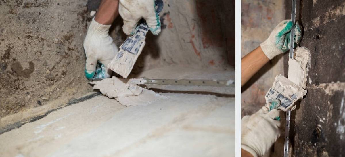 - Оставшиеся от него места на стене заделайте подходящим штукатурным раствором – гипсовым или цементным. Технология работ такая же, как при обычном оштукатуривании.