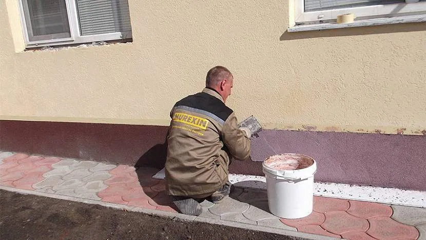 - если дом стоит на бетонной ленте, то в процессе его эксплуатации на фундаменте могут образоваться мелкие и довольно глубокие трещины. Здесь подготовка к нанесению штукатурки несколько отличается: все зазоры следует проштробить, то есть разрушить края щелей настолько, насколько этому поддается бетон. Таким образом, все ослабленные места будут ликвидированы и останется прочная основа. Далее трещины тщательно «выметаются» сухой кисточкой;