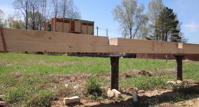 Используется брус сечением 200 : 200 мм, или пачка обрезных досок 50 : 200. Балки устанавливаются по периметру дома (под внешними несущими стенами), по линиям внутренних несущих стен, а также связывают остальные опоры, чтобы выровнять нагрузки и привязать все стволы к общей системе.