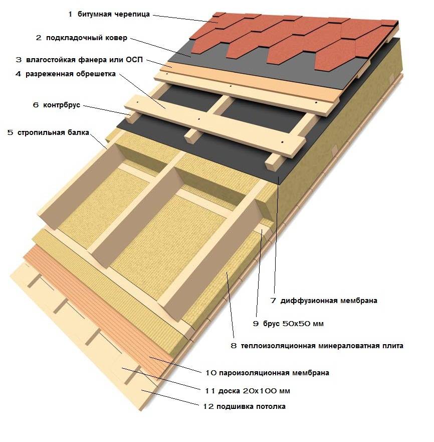 При постройке простого сарая можно исключить ряд перечисленных элементов, но при возведении крыши тёплого гаража или пристроек, а особенно жилого дома, все составляющие имеют большое значение.