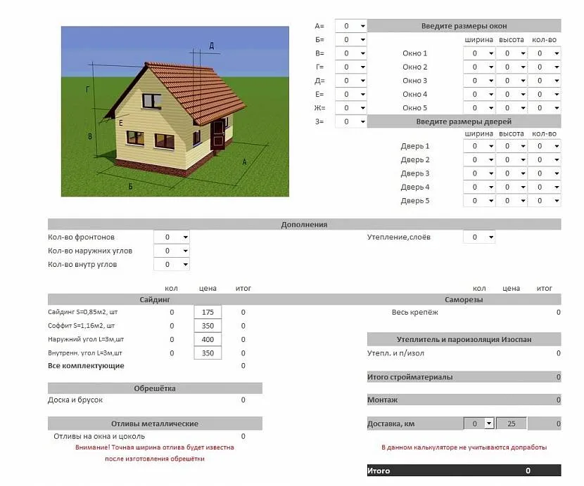 Так выглядит онлайн-калькулятор – надо указать линейные размеры дома и проемов, а в результате получаем примерное количество сайдинга и крепежных элементов, которые понадобятся для отделкиИсточник myprofnastil.ru