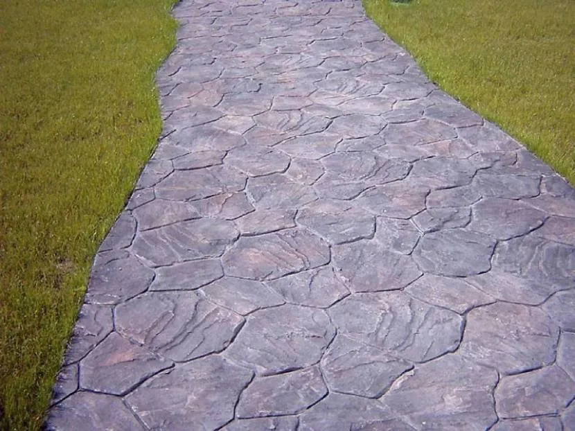Такой вариант делается на свежезалитой поверхности монолитной бетонной дорожки. Применив специальную форму-штамп, вы достигнете красивого результата. Принцип заключается в отпечатывании фактуры в незатвердевшем бетоне. После удаления форм останется незамысловатый рисунок.