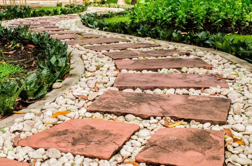 Промежутки между камнями тропинки можно засыпать землёй, смешанной с семенами. Проросшая трава поможет дорожке органично вписаться в окружающий природный ландшафт.