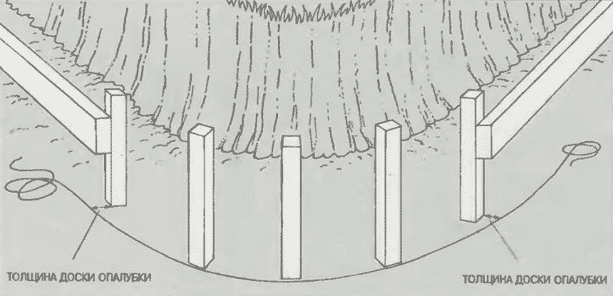 1. Забивка кольев на кривых линиях. Уложите шнур по дуге кривой вдоль части дорожки. Начните кривую линию у крайних кольев кривой но расстоянии от внутренней поверхности кола, равном толщине доски опалубки, так как толщина металлической полосы равна всего 2 мм. Забейте опорные колья с интервалами от 300 мы до 1 м в зависимости от радиуса кривой. Чтобы получить наклон кривой для стока воды на ровной поверхности грунта, натяните шнур от верхней кромки одной доски до верхней кромки другой доски так, чтобы он обогнул все колья. Отметьте линин уклона в местах, где шнур касается кольев. Снимите шнур.