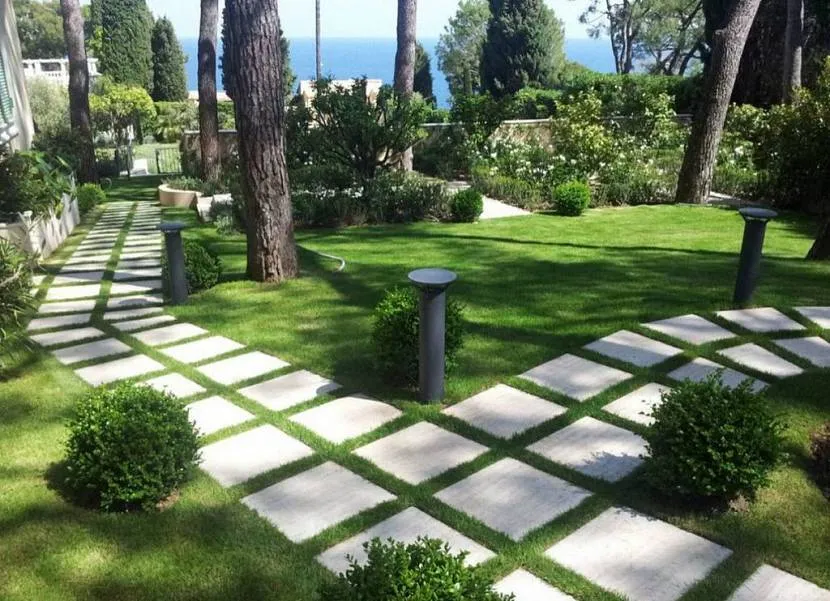Если уложить плиты с небольшим зазором, то в промежутке между ними можно посеять траву.