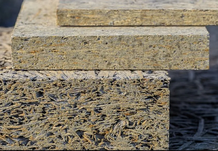 Сырье создают из древесных отходов, которые смешивают с бетонным раствором и минеральными добавками. Готовую массу выливают в специальные плоские формы, прессуют и сушат при высокой температуре. Полученный строительный материал не горит, не разрушается от гнилей, бактерий и насекомых.