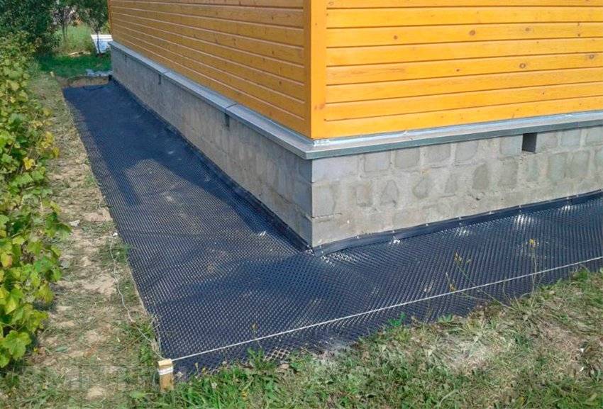 Потом полотно нужно перебросить на подсыпку, хорошо притоптать и подвернуть край на цоколь. В этом месте желательно выполнить плотное примыкание, промазав основание цоколя битумным герметиком и закрепив гидроизоляцию металлической планкой и дюбелями через 50–60 см. Крепление выполняется только в последнюю очередь, когда весь холст плотно придавлен к основе, а все складки и неровности разглажены.