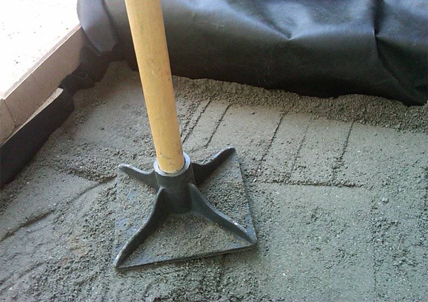 Формирование компенсационного шва. К стене строения крепят демпферную ленту или рубероид. Этот зазор позволит уменьшить давление на фундамент и предотвратить появление трещин на бетоне. Можно также вдоль стены поставить деревянную доску, которую после заливки нужно убрать, а оставшуюся после неё щель заполнить песком; Заливка бетона. Покупается готовый состав М400 или приготавливается с помощью бетономешалки. При самостоятельной заготовке смеси используют следующее соотношения компонентов: 1 часть портландцемента, 3 части песка, 4 части щебёнки и воды примерно 50% от количества цемента