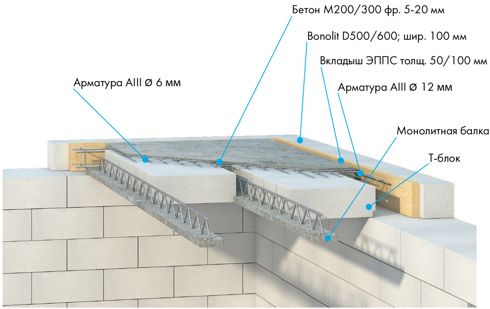 Ригели кладутся с шагом в 600-1000 мм. В пространство устанавливаются блоки или легкобетонные плиты. Швы обрабатываются цементно-песчаным раствором. Для этого межэтажного перекрытия необходима изолирующая прокладка.
