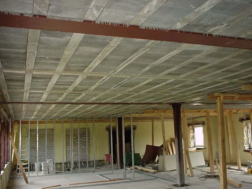 Снизу под перекрытием некрасивые балки и листы гофрированной жести можно скрыть подвесными или натяжными потолками, гипсокартоном.