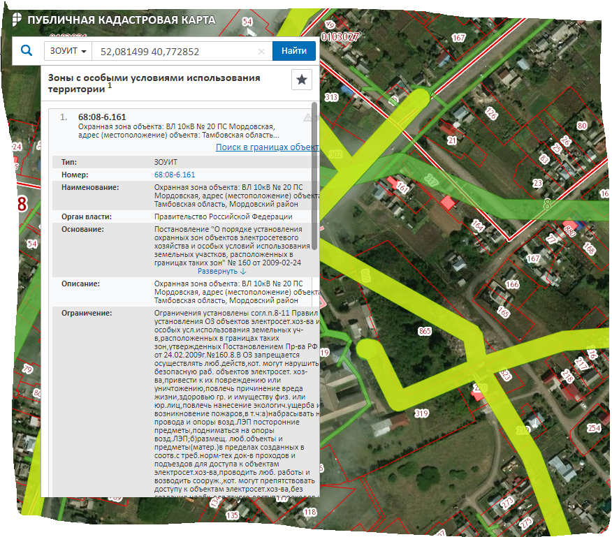 Обратите особое внимание на зоны с особыми условиями использования (зеленая заливка), т.к. при нахождении участка в пределах такой зоны в дальнейшем могут выявиться ограничения в его использовании.