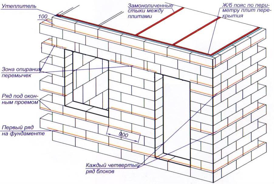 Схема расположения арматуры в пристройке к дому из пенобетона