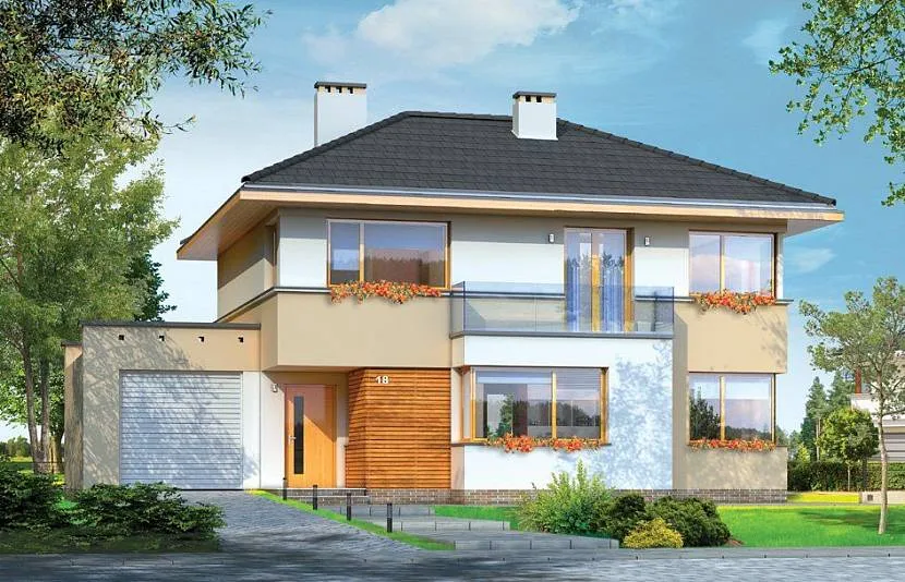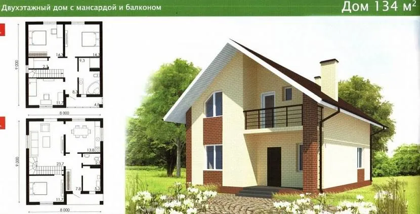 Классический проект дома с мансардой дополнен балконом и гаражомИсточник 1beton.info