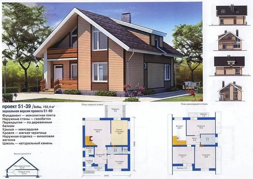 Проект дома из газобетона с мансардой общей площадью 152,4Источник yurlkink.ru