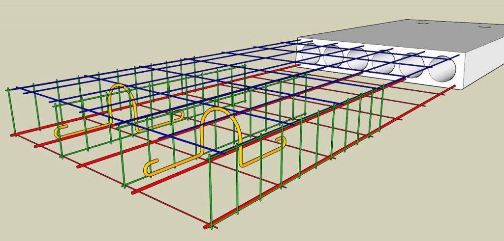 Благодаря такому варианту упрочнения удается устранить провисание плит перекрытия, а также становится возможным выдерживать значительные нагрузки. В торцы изделия, которым оно опирается на несущие стены, выполняется монтаж двойной арматуры. Таким образом,удается предотвратить не только деформацию под давлением собственной массы, но и выдерживает давление от верхних несущих конструкций.