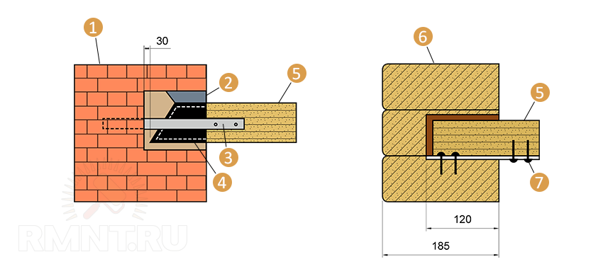 Если свод монтируют к каменным стенам, необходимо концы балок обернуть рубероидом или обработать смолой, обеспечив гидроизоляцию. Проем в стене, который используется в качестве опоры для балок, поддерживающих деревянные перекрытия между этажами в кирпичном доме, создают такого размера, чтобы присутствовал зазор для вентиляции. Это позволит избежать образование конденсата и дольше сохранить древесину от разрушения.