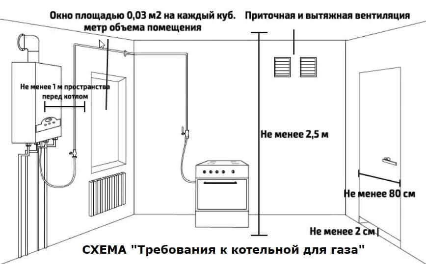 • газовое оборудование недопустимо устанавливать в жилых комнатах; • высота потолков в помещении должна быть не менее 2,2 метра; • не допускается отделка стен, потолков и полов горючими материалами; • между полотном двери и полом должен быть зазор для поступления воздуха;