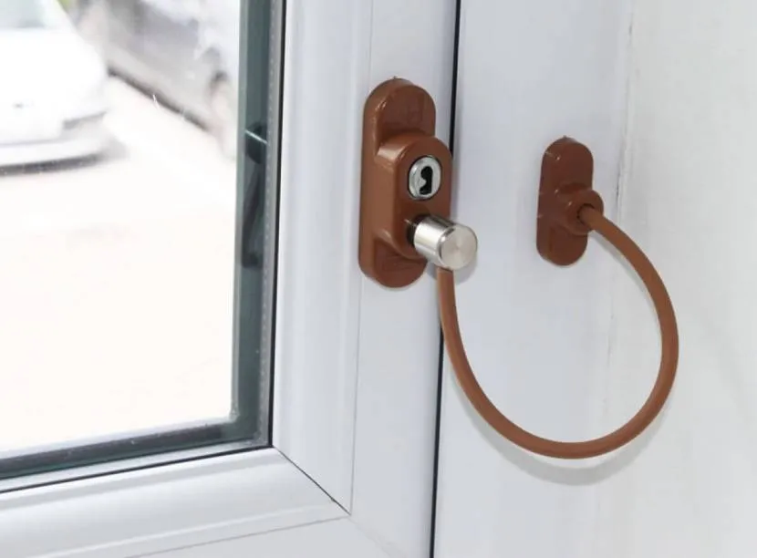 - Тросовый блокиратор. Весь механизм представляет собой замок, который монтируется на оконной створке, и трос, который соединяет ее с оконной рамой. При этом возможно откидывание, угол которого определяется длиной троса. Для полного распахивания окна требуется ключом отпереть замок и отсоединить трос.