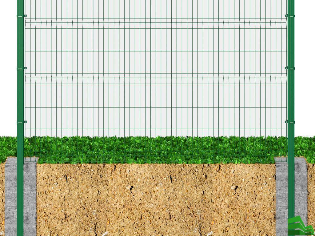 Конструкция 3Д забора представляет собой полотно, собранное из секций одинакового размера. Существует два типа стандартных элементов, отличающихся высотой секций (1 и 1,5 м). Они оснащены тремя ребрами жесткости. Комбинируя их, можно составлять ограждения разной высоты.