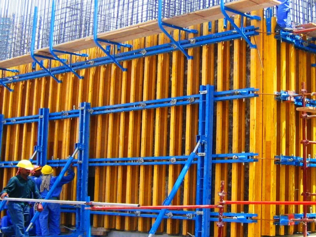 - Крупно-щитовая, разборно-переставная опалубка, используется для крупномасштабного строительства, вес 1 щита начинается от 50 кг. Несколько щитов монтируются в замкнутую систему, которая разбирается и очищается после застывания бетона. Из-за большого веса, в монтаже или перемещении щитов используется крупная грузоподъёмная техника.