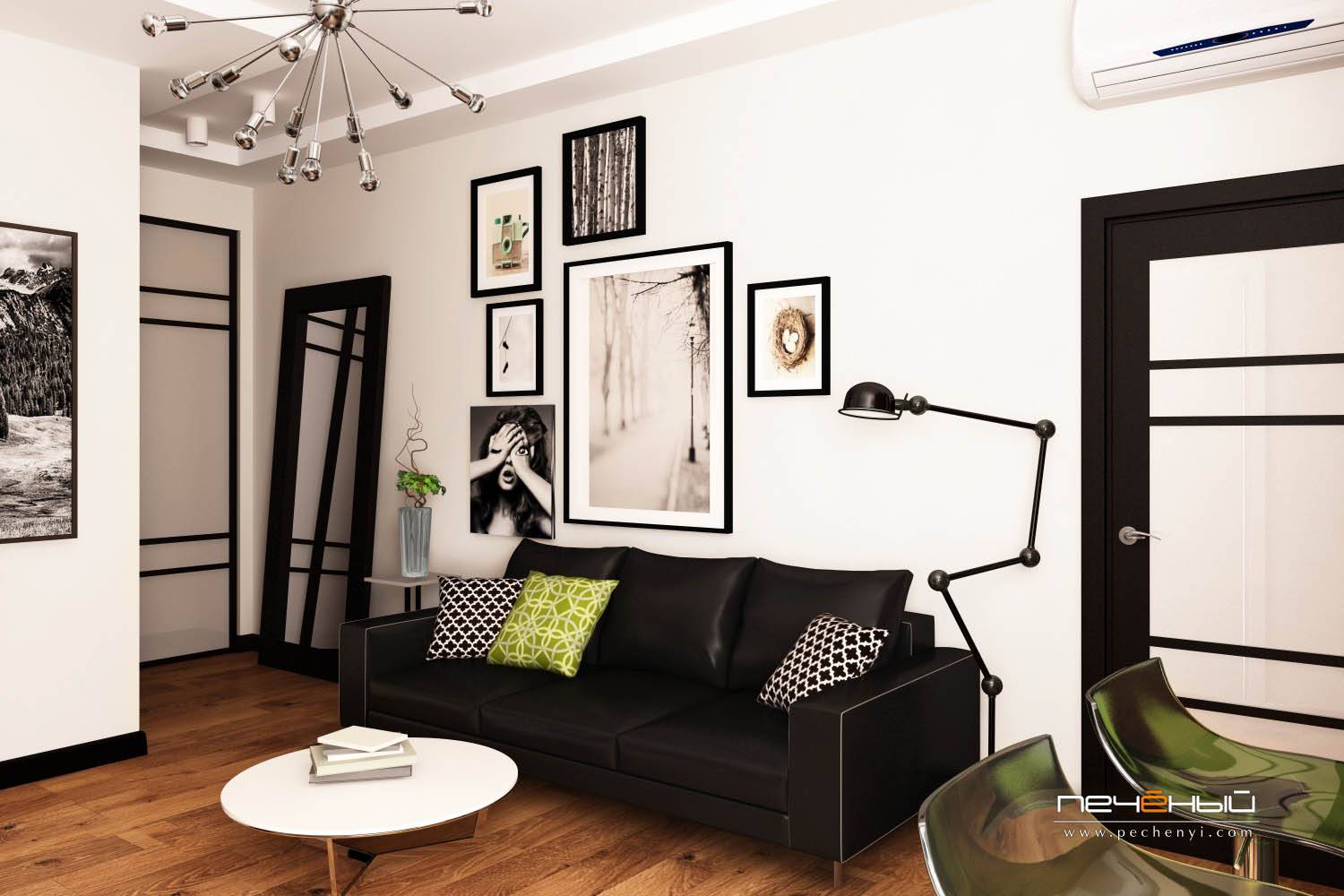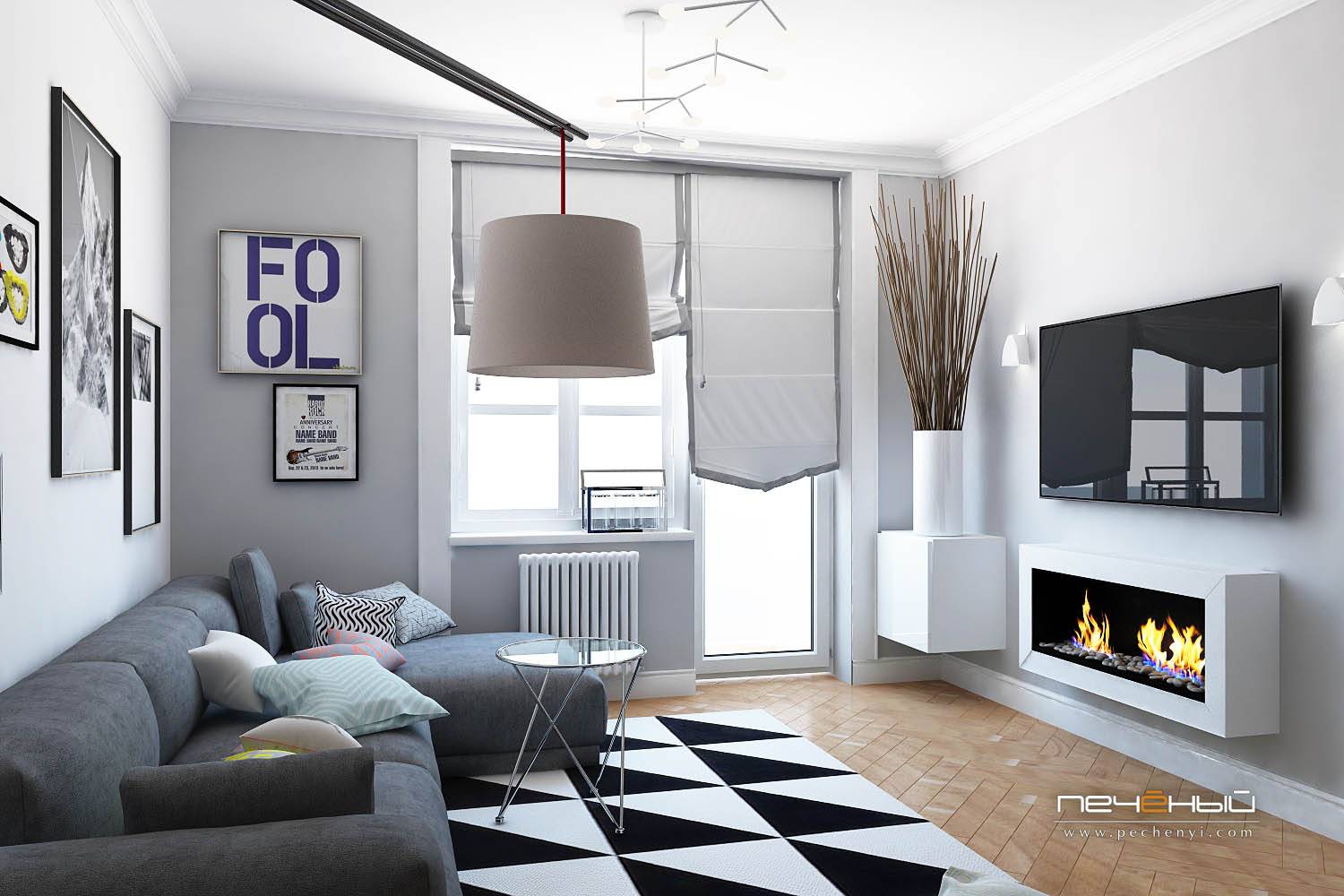 Современное скандинавское оформление выполняют в чёрно-белом цвете. Чёткие линии создают контраст на белом фоне, позволяя визуально корректировать геометрию комнаты. Активно используют серый оттенок.