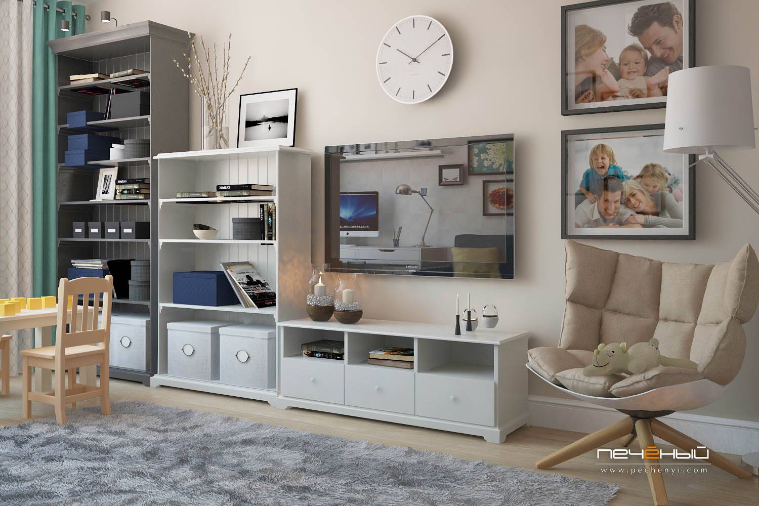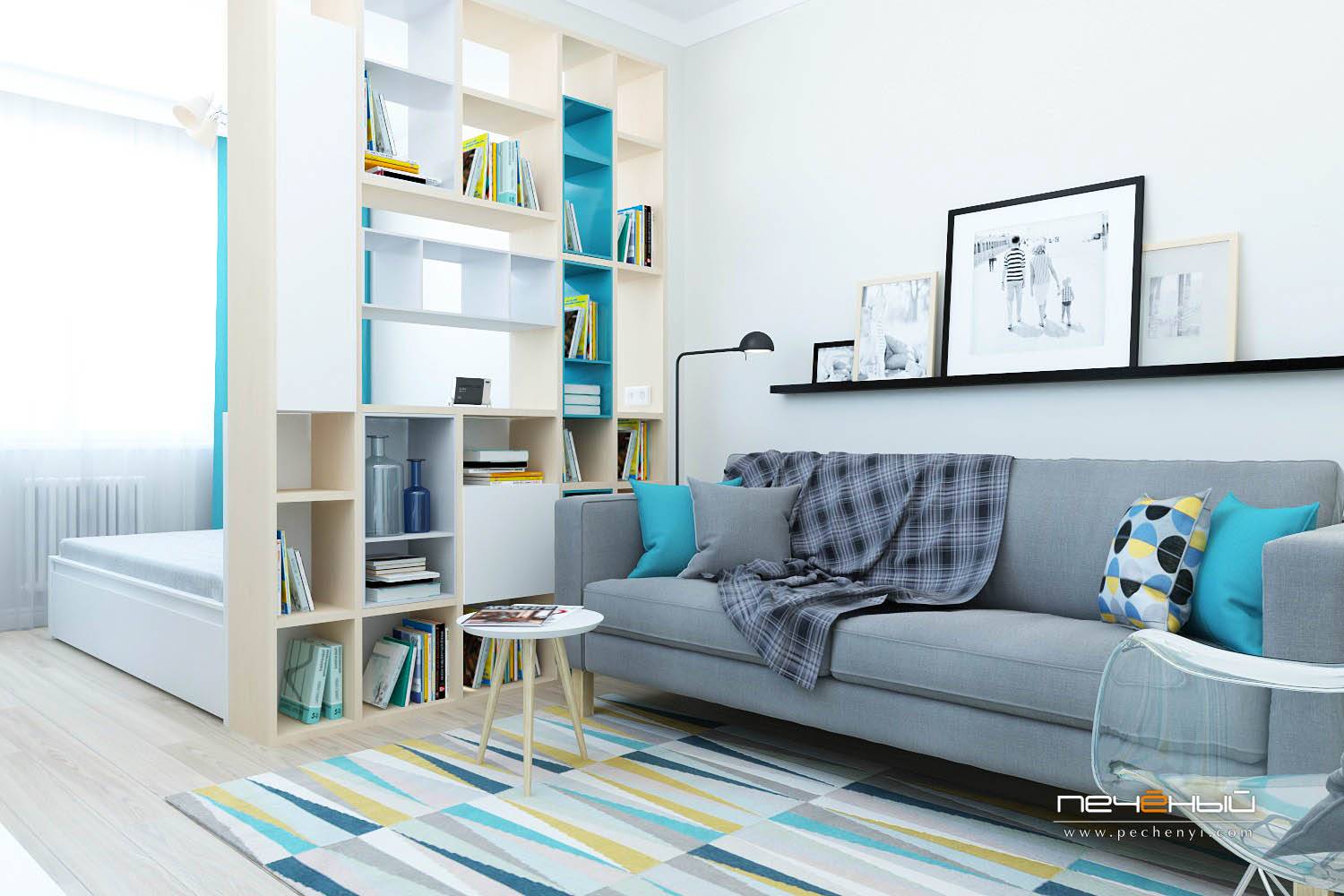- в полной семье, состоящей из взрослых и детей, гостиные в двухкомнатных квартирах используются в качестве спальни. Здесь необходимо правильно поделить помещение на зоны, выделив место для сна, встречи гостей и развлечений. Лучше всего зонировать помещение с помощью большого деревянного стеллажа;