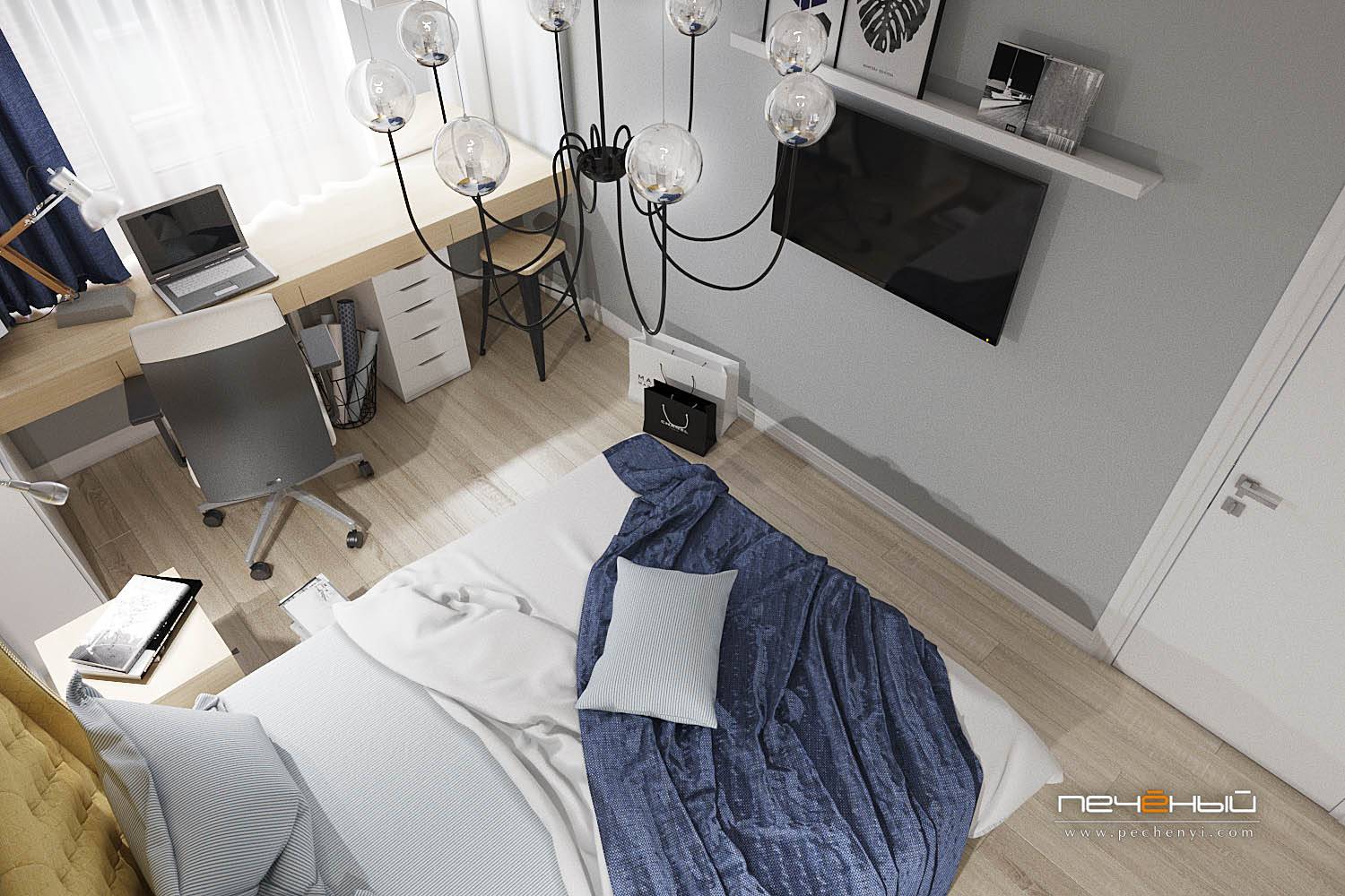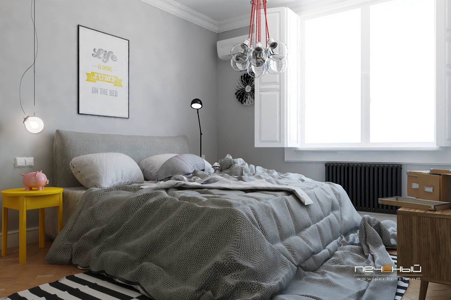 Еще одним традиционным для скандинавского интерьера цветом является серый. Отличительным его преимуществом считается способность придавать отдельным элементам помещения яркость и выразительность. На сером фоне выигрышно будут выглядеть белоснежная кровать и шкаф в скандинавском стиле. Легкие шторы кажутся плотнее, а живые цветочные композиции – красочнее. Удачными цветовыми тандемами являются серо-кофейный, серо-белый, серо-синий и серо-розовый оттенки.