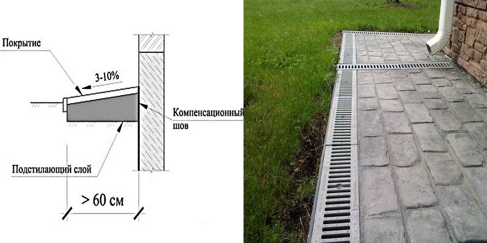 Уклон в процентах – это соотношение высоты к ширине. Например, уклон в 5% означает, что на каждый метр ширины конструкции должны приходиться 5 см по высоте. При этом уклон обеспечивается в направлении от здания, то есть самая высокая точка должна располагаться у стены дома, а самая низкая, на расстоянии от него.
