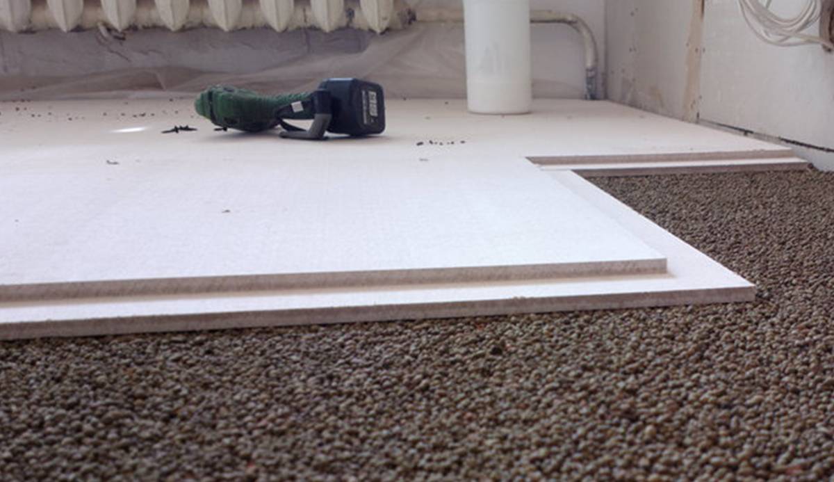 - Утрамбованные и выровненные участки прикрывают плитами ГВЛ, соединяя их между собой саморезами или клеем. В качестве дополнительной прослойки перед укладкой финишного покрытия можно использовать плиты пенополистирола.