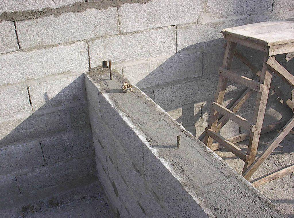 Строительство блочных стен аналогично кирпичной кладке. На квадратный метр стены требуется до 12-ти литров раствора, шов устраивается размером в десять – двенадцать сантиметров. Для улучшения прочности стены используют арматурные пруты.