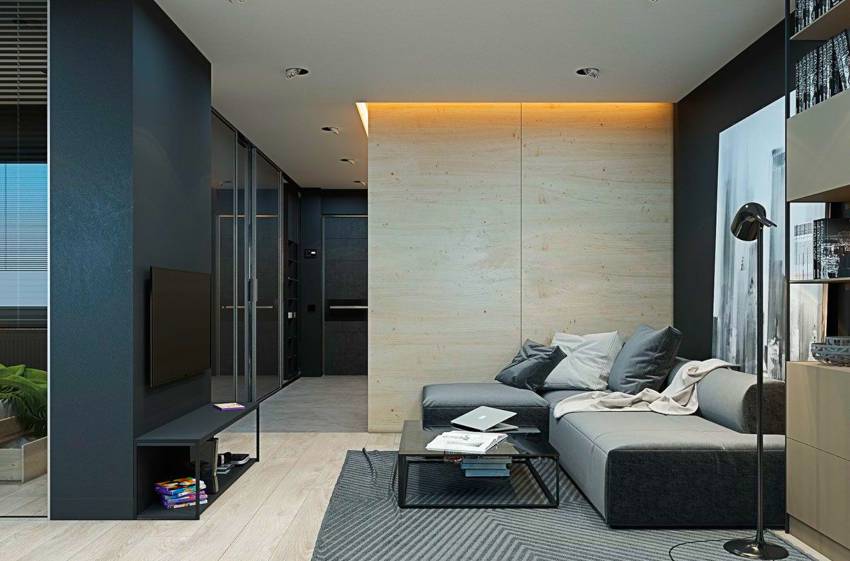 - при желании можно оформить диванную зону небольшим однотонным ковром с коротким ворсом или моделью с едва заметным геометрическим принтом;