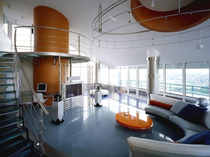 Самые современные технологические новинки находят применение в оснащении дома хай-тек. Множество пультов и кнопок теперь может заменить интерактивная панель, с которой можно управлять кондиционированием воздуха, отопительной системой, охранными приборами и так далее. По сути, это большой компьютер, контролирующий все коммуникации и приборы интерьера.
