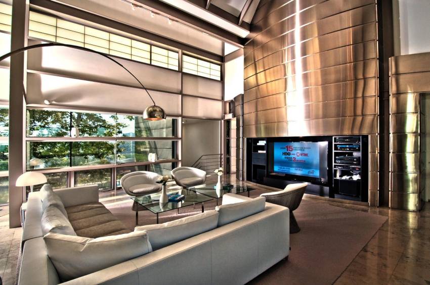 Современный стиль предполагает электронное оснащение дома. В нем нет проводов, шнуров. Все они скрыты за панелями или внутри стен интерьера. Освещение, жалюзи на окнах, музыкальная и видео аппаратура включается пультом дистанционного управления.