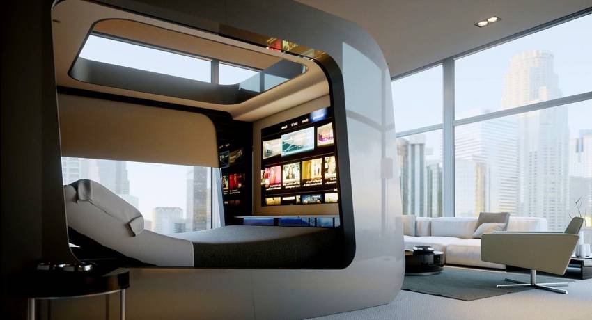 «Космический» стиль дизайна предполагает светлые тона, отсутствие нагромождений и излишеств в декоре хай-тек, гладкие поверхности стен, потолка и пола. Хорошее освещение подчеркивает чистоту линий и зрительно раздвигает границы пространства.