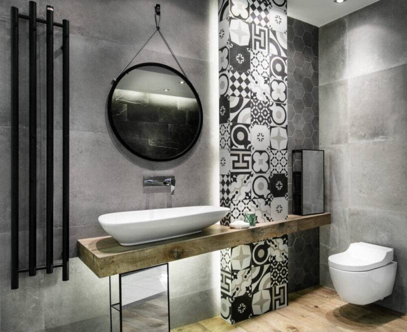 Комбинирование разных типов плитки является неотъемлемым элементом дизайна данной комнаты. Для нас традиционным является горизонтальное деление стен, однако, актуальны сейчас вертикальные полосы на стенах.