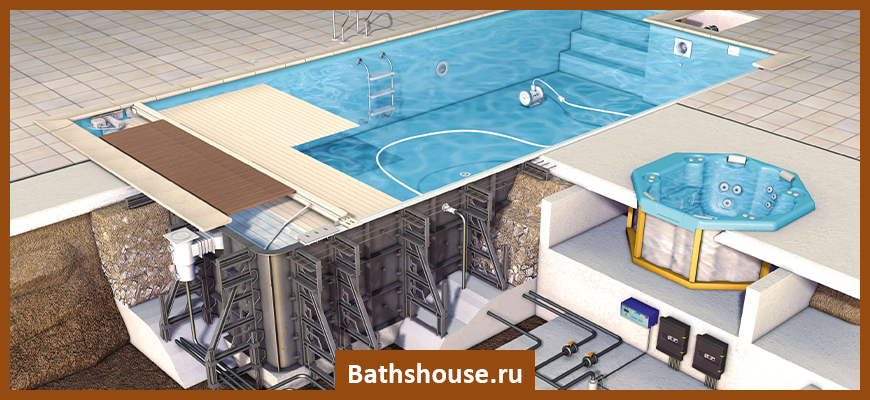 Кроме подведения коммуникаций водоснабжения в стационарном бассейне потребуются и другие устройства, которые обеспечат комфорт в пользовании сооружением: